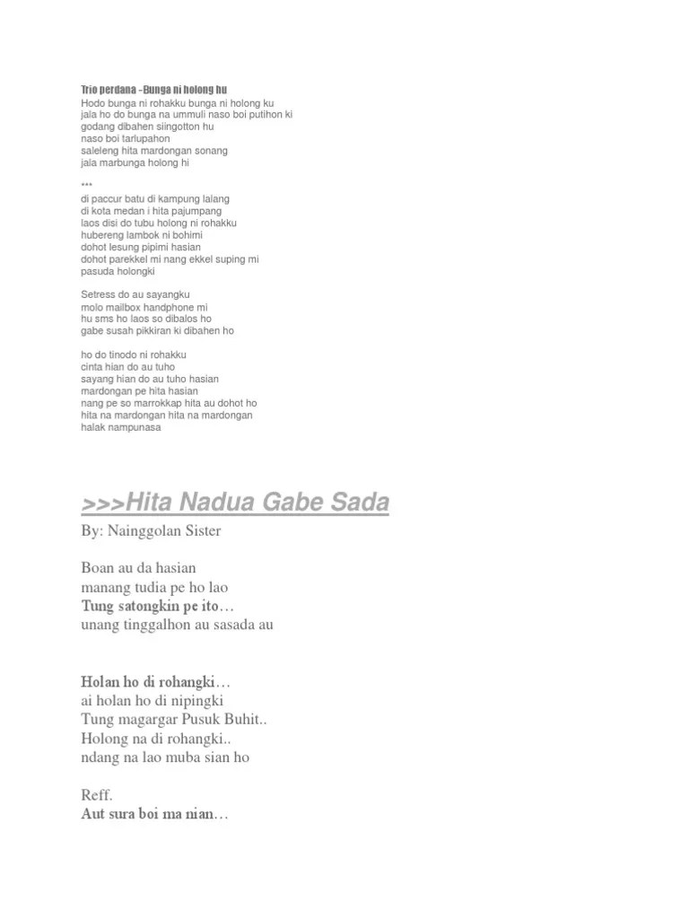 Rappak marsoban hita nadua tu harangan i mulak sikkolai hu hehe i ma ho mekkel supping ho tu au ** borhat ma au tu parjalangan i ro ho tu au . Dm f hu hehei ma ho. Mekkel subing ho tu au. Berikut lirik dan chord lagu . G am f g g am f g rappak marsoban hita nadua.